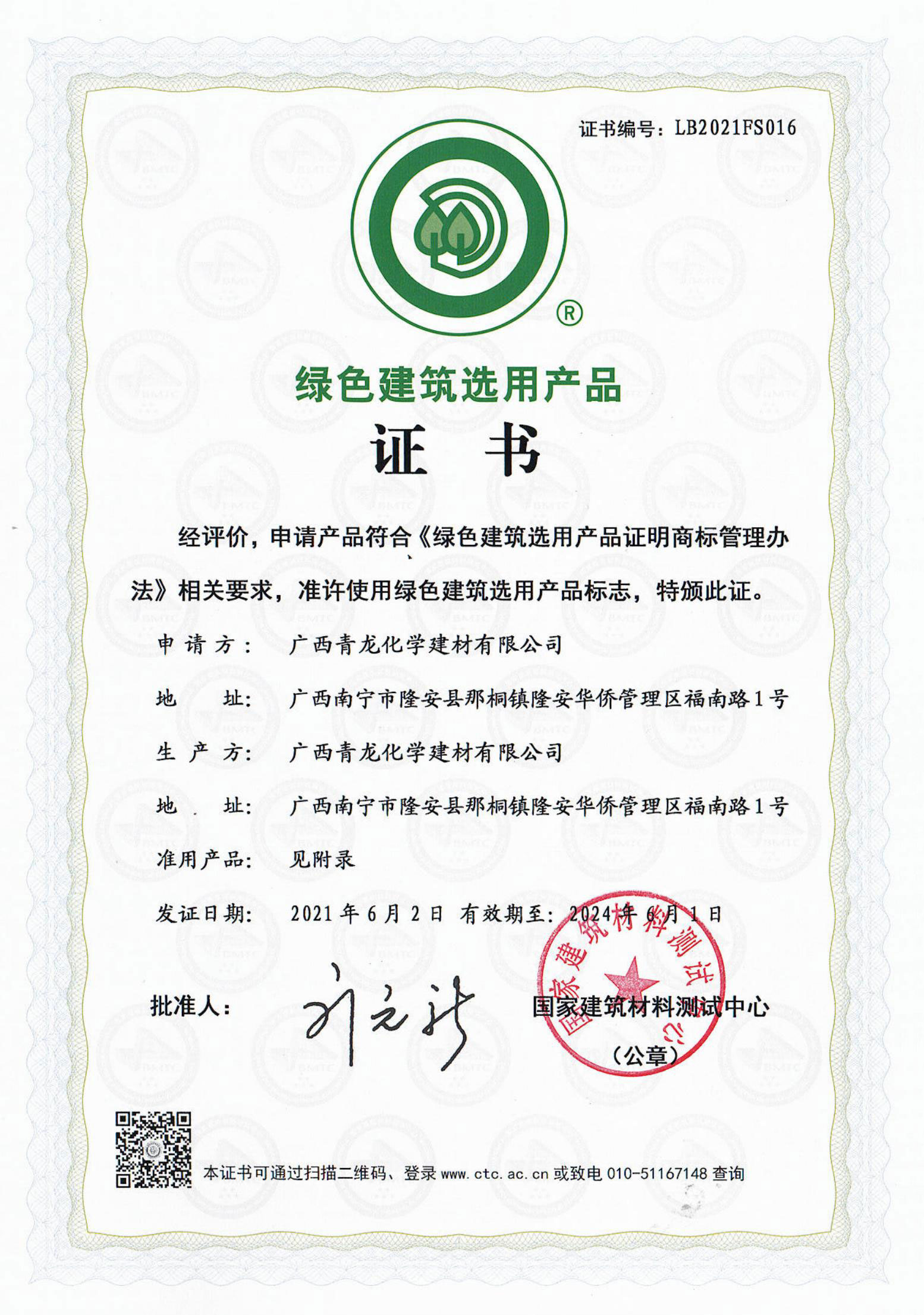 綠色建筑用用產(chǎn)品證書