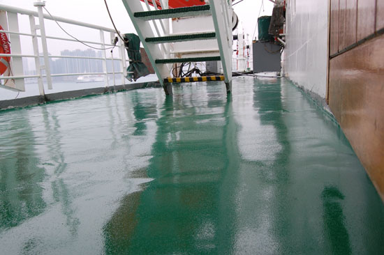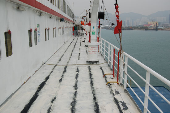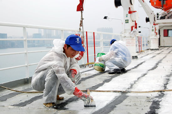 接到該訂單后,3月21日,公司派一支素質(zhì)過硬的施工隊(duì)伍奔赴香港開始作業(yè),由于期間香港天氣變化反復(fù),時(shí)常下雨;待基面底漆頑固,銹跡斑斑難以清理,均為凹凸不平的麻面;再加上該郵輪白天需正常營業(yè),施工多只能在晚上進(jìn)行,等等一系列因素都給施工帶來了嚴(yán)峻考驗(yàn)。青龍公司歷來重視每一筆訂,注重每一個(gè)細(xì)節(jié),董事長宋敦清先生得知后,親自前往,與公司總工徐新生論證了一個(gè)較好方案后開始指導(dǎo)施工,考慮到施工部位特殊,長期在海面上風(fēng)吹日曬,之后選用了其耐候、耐酸堿、耐紫外線、耐老化、耐霉菌、耐鹽霧、耐臭氧、耐溶劑、耐磨、耐沖擊和耐油性等綜合性能優(yōu)異的