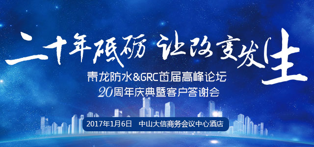 2017年1月6日,由青龍建材主辦的2017年防水&GRC高峰論壇、青龍建材20周年慶典暨客戶答謝會將于廣東中山市大信商務(wù)會議中心酒店盛大舉行,期間將邀請國內(nèi)外著名專家學(xué)者蒞臨參會,旨在齊聚防水和GRC行業(yè)各界人事,共同探討當(dāng)前形勢下行業(yè)發(fā)展前景和中國建筑業(yè)的趨勢,破解行業(yè)難題。青龍建材作為東道主和主辦方,將就公司未來發(fā)展戰(zhàn)略作出重要闡述。此次行業(yè)大咖再次齊聚一堂將會碰撞出怎樣的火花,我國防水和GRC的未來究竟該如何?青龍建材誠邀行業(yè)同仁蒞臨參與拭目以待。