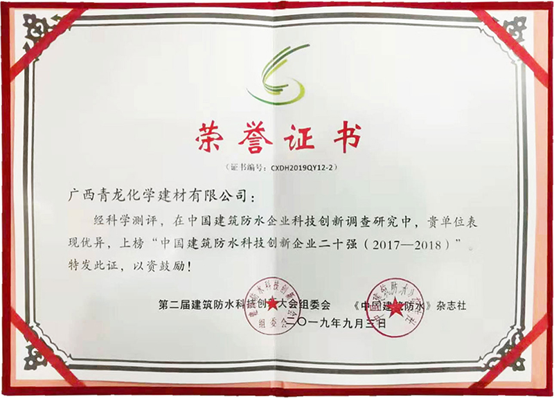 9月,第二屆建筑防水科技創(chuàng)新大會(huì)上,青龍司榮獲"中國(guó)建筑防水科技創(chuàng)新企業(yè)二十強(qiáng)",成為繼獲得首屆建筑防水科技創(chuàng)新大會(huì)"科技先鋒企業(yè)"和"科技先鋒人物"之后,青龍?jiān)佾@"科技"類殊榮,彰顯了青龍公司強(qiáng)勁的科技創(chuàng)新實(shí)力和在行業(yè)的技術(shù)地位。