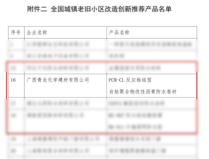 近日,由中國建筑節(jié)能協(xié)會綠色社區(qū)專業(yè)委員會主辦,全國城鎮(zhèn)老舊小區(qū)改造創(chuàng)新推薦產(chǎn)品、技術(shù)申報企業(yè)材料評審會圓滿結(jié)束,在公開、公平、公正的原則下,青龍公司自主研發(fā)生產(chǎn)的PCM-CL反應(yīng)粘結(jié)型自粘聚合物改性瀝青防水卷材成功入選全國城鎮(zhèn)老舊小區(qū)改造創(chuàng)新產(chǎn)品推薦名單。