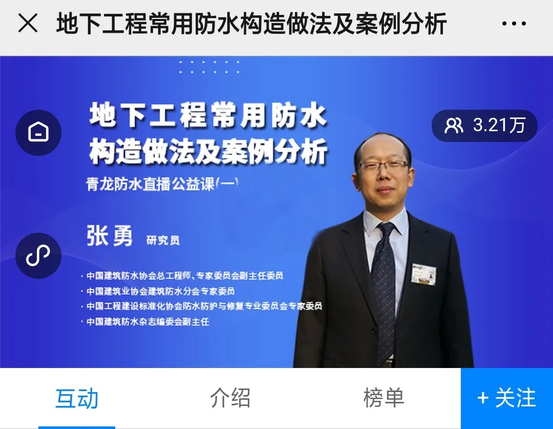 目前,防水公益大講堂已經(jīng)直播了三位防水行業(yè)重量級的大咖:中國建筑防水協(xié)會副會長瞿培華、防水博士張勇、中國建筑防水協(xié)會專家委員會副主任委員朱志遠(yuǎn)。直播粉絲平均3萬,場場精彩,讓人大受啟發(fā),轟動了整個防水行業(yè)。