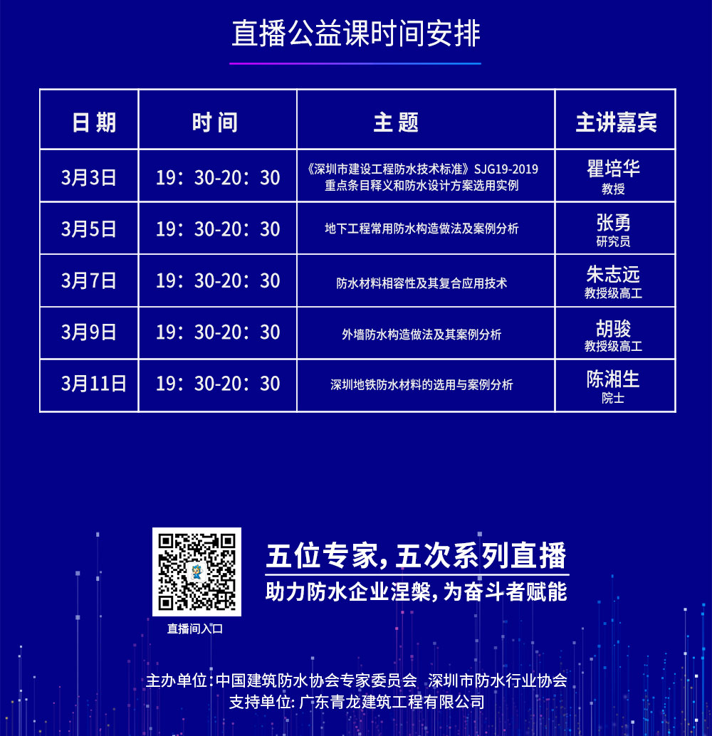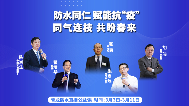 本次防水公益直播是為貫徹落實黨中央關(guān)于新冠肺炎疫情防控工作的決策部署,積極響應(yīng)各級政府的號召,由中國建筑防水協(xié)會專家委員會、深圳市防水行業(yè)協(xié)會主辦,廣東青龍建筑工程有限公司協(xié)辦,直播由陳湘生院士領(lǐng)銜,瞿培華教授、張勇博士、朱志遠(yuǎn)教授和胡駿教授4位專家支招,助力防水企業(yè)涅槃,為奮斗者賦能,讓我們防水人同氣連枝,共盼春來。