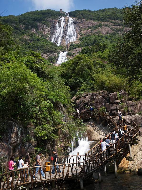 瀑布下的親水步道上悠游漫步,是接近自然接近仙瀑的更輕松方式。親水步道的入口與“天南一梯"的第2 9 9級相接,通至第1 2 9 9級的觀瀑臺,全長6 6 6米,是一條天然的木棧道。走在上面,游人可以一邊眺望白水仙瀑的翩翩美態(tài),一邊前行,任潺潺的流水有如活潑歡快的音符般在腳下跳躍奔流。