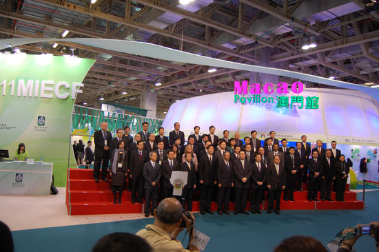 圖為:本屆展會(huì)出席政商代表(前排右三為澳門(mén)特首崔世安)在澳門(mén)展館前留影