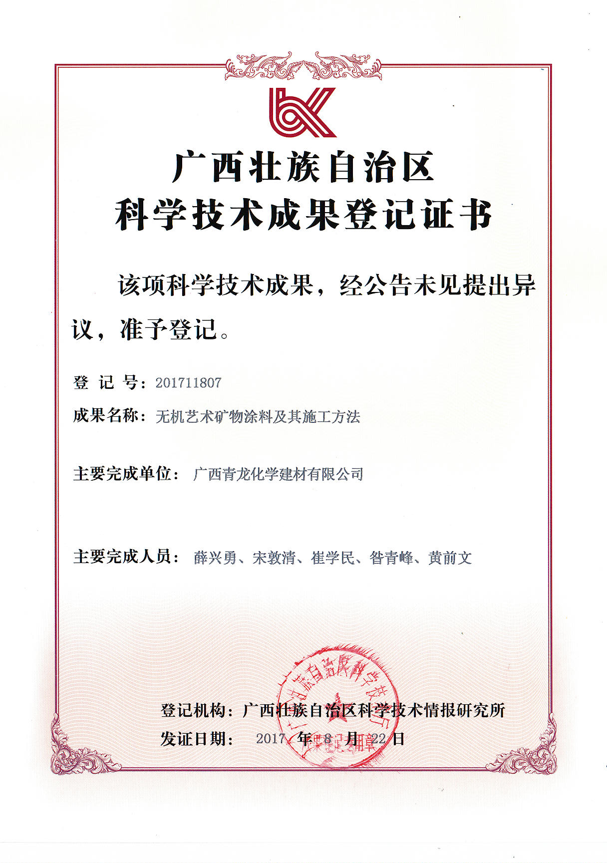 無機(jī)藝術(shù)礦物涂料及其施工方法科技證書