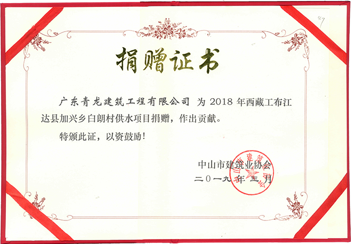 3月28日,在中山市建筑業(yè)協(xié)會(huì)第七屆二次會(huì)員大會(huì)暨工程創(chuàng)優(yōu)表彰大會(huì)上,由市住建局主導(dǎo)的支援西藏工布江達(dá)縣項(xiàng)目,由于青龍支持得力,受到市住建局和建筑業(yè)協(xié)會(huì)的高度表彰,被頒發(fā)榮譽(yù)證書(shū)。