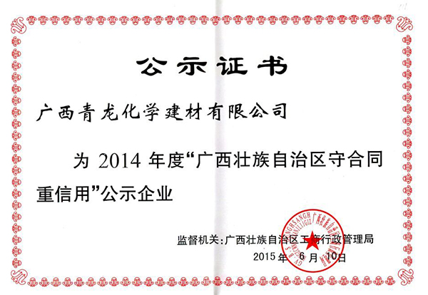 近日,青龍集團(tuán)廣西公司喜訊頻傳,獲得廣西區(qū)工商管理局頒發(fā)的2014年度廣西壯族自治區(qū)“守合同重信用企業(yè)”榮譽(yù)稱號,市工商局特別頒發(fā)了證書。