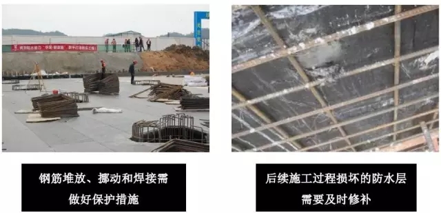 2、防水層施工后,鋼筋砼結(jié)構(gòu)底板施工前的相鄰工序,如支模板、捆扎鋼筋(焊) 等,需要相應(yīng)班組對防水層的實時、悉心保護(hù);