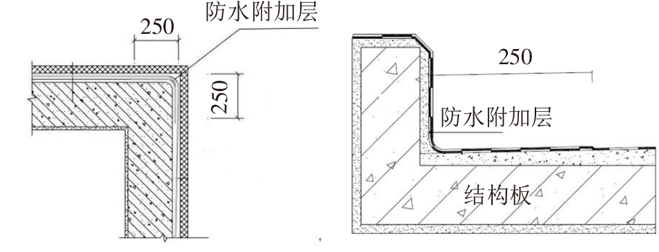 在基面陰陽(yáng)角兩側(cè)做好防水附加層,其總寬度為500mm左右。平立面連接處的陰陽(yáng)角需抹成圓角形狀,其中陽(yáng)角半徑大于20mm,陰角半徑大于50mm(圖6)。