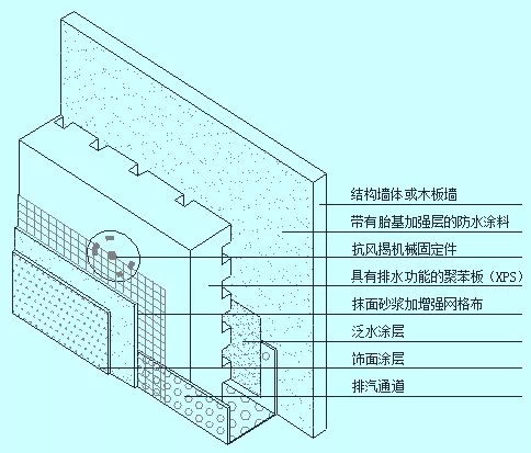 1、國外雙墻結(jié)構(gòu)比較多,外墻漏水會延著空腔往下流,由出水口流至外面;另外一種就是通過有排水功能的聚笨板將水排到地面。