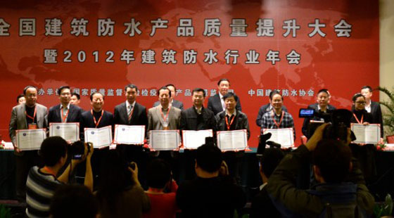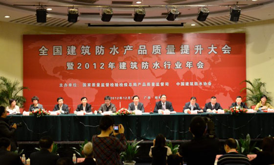 2012年12月7日,全國建筑防水產(chǎn)品質(zhì)量提升大會在桂林召開。此次會議由國家質(zhì)量監(jiān)督檢驗檢疫總局、中國建筑防水協(xié)會主辦,來自25個省(自治區(qū)、直轄市)質(zhì)監(jiān)部門和生產(chǎn)許可管理部門的負責人,以及全國建筑防水行業(yè)骨干企業(yè)的負責人,共計450多人出席會議。