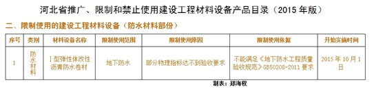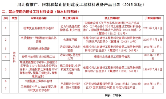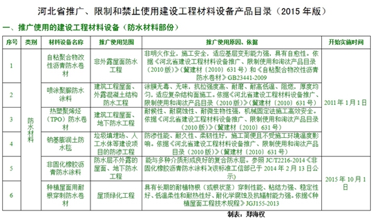 2015年版目錄是前七批“推廣、限制和淘汰使用產(chǎn)品目錄”的綜合更新版。其中,保留了仍需推廣、限制和禁止使用的建材裝備,結(jié)合近幾年河北省工程建設(shè)實(shí)際,又增補(bǔ)了新的內(nèi)容。本目錄共涉及182種產(chǎn)品,包括推廣類87種(新列入29種),限制類25 種(新列入12種),禁止類70種(新列入20種),新列入的各類產(chǎn)品,生效時(shí)間從2015年10月1日起實(shí)施。其中防水材料部份,推廣類6項(xiàng)(新列入2項(xiàng)),限制類1項(xiàng)(新列入1項(xiàng)),禁止類7項(xiàng)(新列入3項(xiàng))。