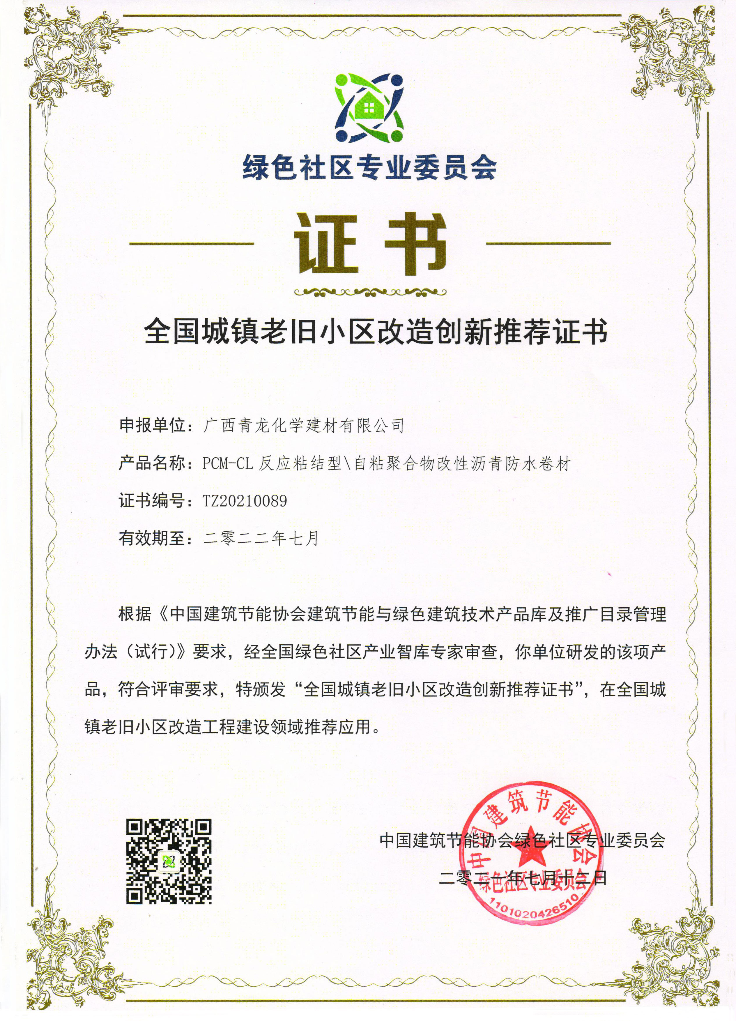 喜訊丨青龍PCM防水卷材入選全國城鎮(zhèn)老舊小區(qū)改造創(chuàng)新產(chǎn)品推薦名單